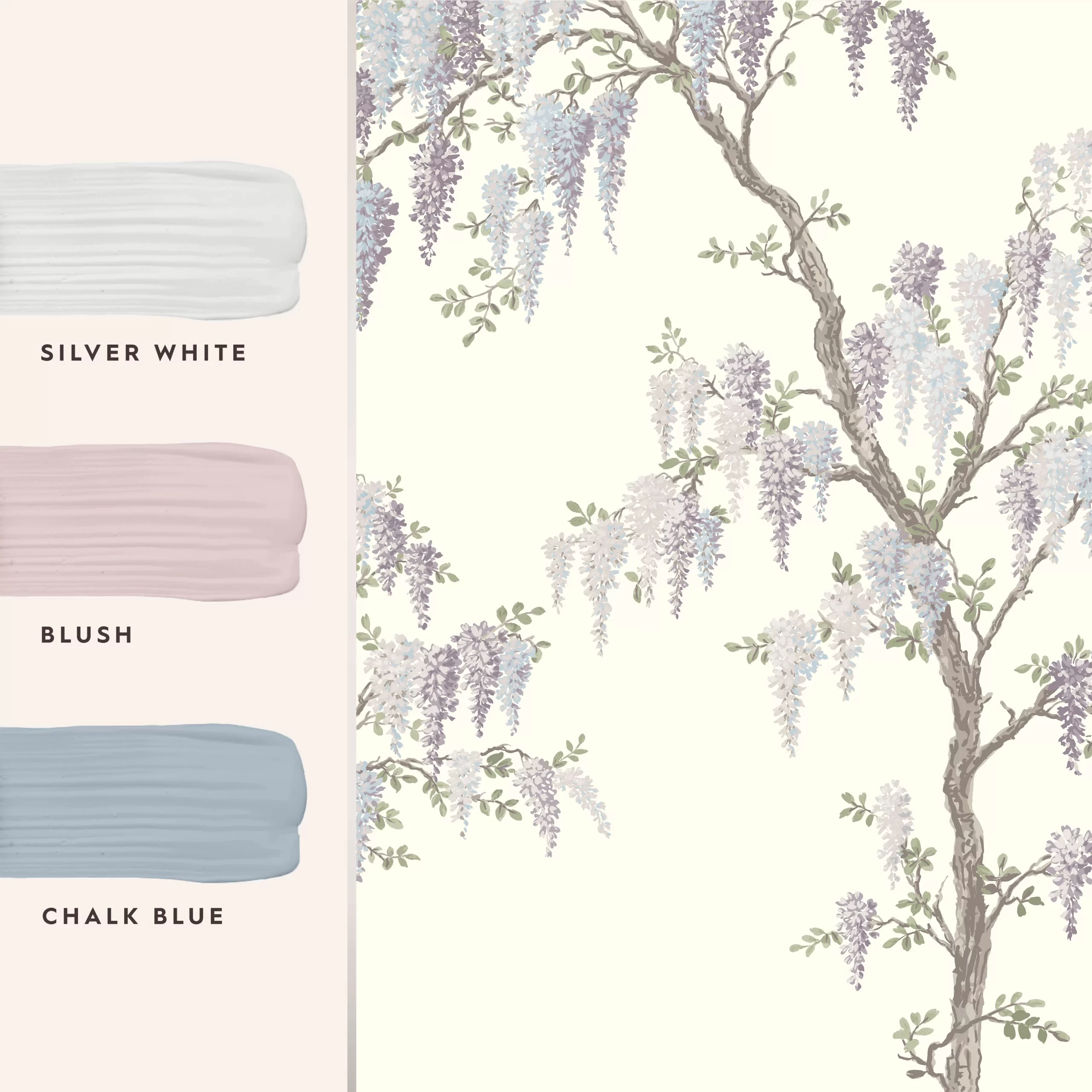 Make a statement wall with our stunning Wisteria mural which features softly trailing branches and blossoms. Laura Ashley murals come on one roll with 6 referenced panels.